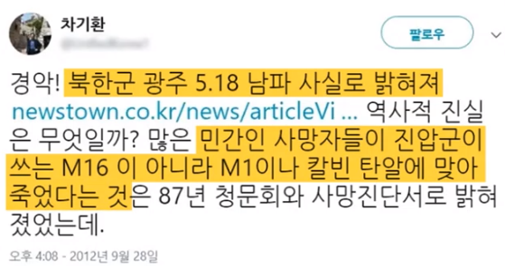 - 5.18관련, 북한국 광주 5.18 남파를 주장하고, '법원의 5.18 폄하 일베 회원 기소를 비판' 유포