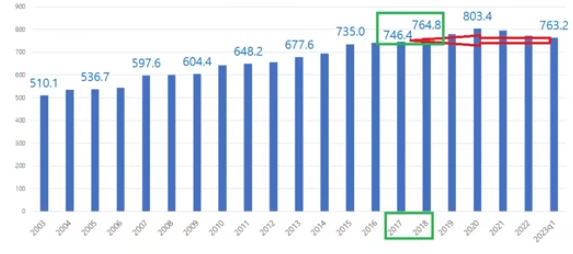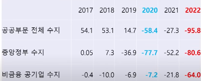 공공부문 적자액 또한 팬데믹 이후 급격히 줄었음을 아래 표로 확인할 수 있다. 팬데믹 때인 2020년에 58조에서 2022년에는 95조로 적자폭이 오히려 더 커졌다. 이는 수출악화 등으로 인한 재정규모의 감소라고 밖에 해석이 되지 않는다.