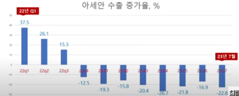 또한 2위 수출시장였던 아세안시장 수출도 감소하고 있다. 5월부터 2021년 이전 수준으로 후퇴하였다.
