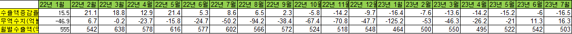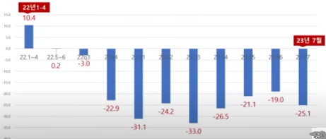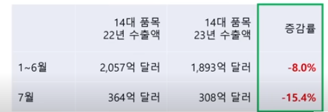 전체 수출의 78% 차지하는 15대 품목중 반도체의 7월 수출액은 -33.6% 감소하였고, 나머지 14대 품목 또한 7월 들어 -15.4% 감소하고 있다. 이는 반도체 수출감소 뿐 아니라, 주요 수출품의 감소를 뜻함이다.