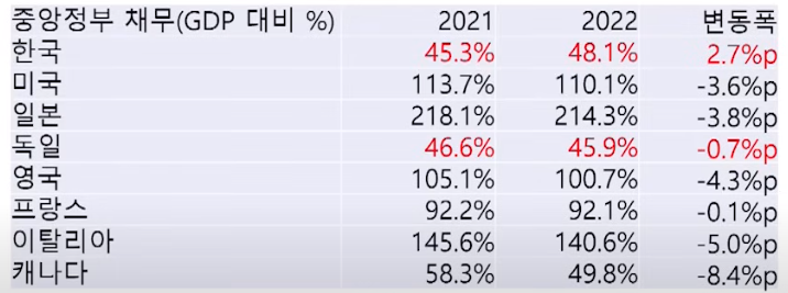 중앙정부 채무는 작년기준으로 G7국중 유일하게 한국만 늘어났음을 볼 수 있다.