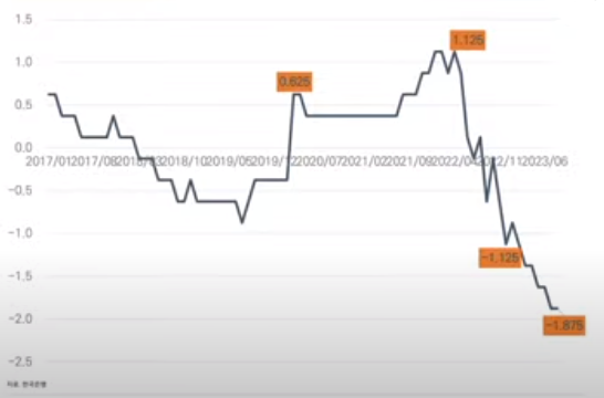 현재 한국과 미국의 기준금리는 이렇게 차이가 난다. 이렇게 금리차이가 난 적은 일찍이 없었다. 한국금리를 못올리는 이유는 가계부채가 많아서이다. 이로 인해 환율은 상승되고, 외환보유고는 줄어들고 있다. 또한 환율변동성은 커짐으로 기업들은 수출입전망을 하기가 어려운 상황이다. (아래 그림에서 보듯, 환율이 짧은 기간동안 널뛰기를 하고 있다)
