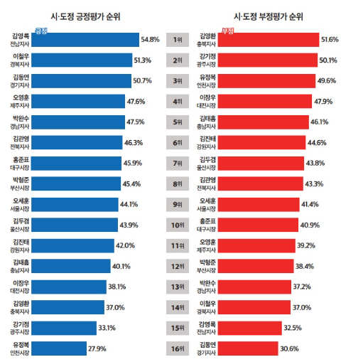 4. 광역 시도 단체장 시·도정 평가 : 긍정평가 1위 김영록 전남지사, 부정평가 1위 김영환 충북지사