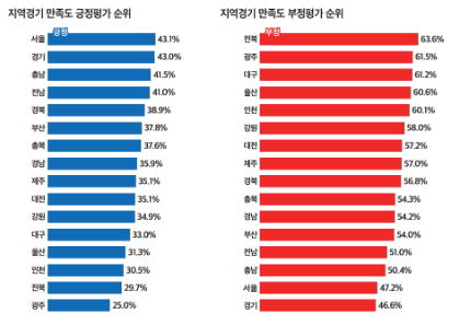 3. 지역 경기 만족도: 긍정= 서울 43.1% 1위, 부정= 전북 63.6% 1위