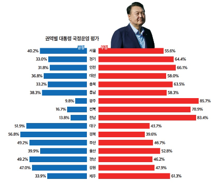 1. 윤 대통령 (16 광역 시·도) 국정운영평가 : 부정 압도적 12곳, 긍정 4곳