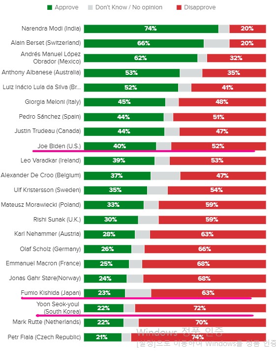 **조 바이든 긍정평가 40% 부정 평가 52%(9위) , 기시다 긍정평가 23% 부정 평가 63%(21위)