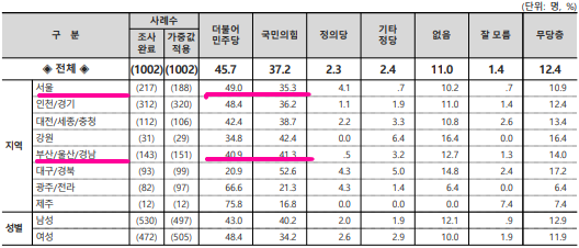 ▲서울 국민의힘 42.2%, 민주당 29.2%, ▲경기·인천 국민의힘 38.4%, 민주당 40.0%, ▲대전·충청·세종 국민의힘 36.5%, 민주당 32.4%▲ 강원·제주 국민의힘 50.128.3%, 민주당 39.4%, ▲부산·울산·경남 국민의힘 48.7%, 민주당 26.3% ▲대구·경북 국민의힘 40.1%, 민주당 24.0%, ▲전남·광주·전북 국민의힘 19.1%, 민주당 50.1%