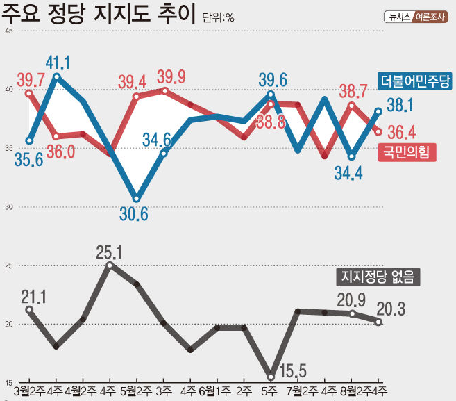 8월 정당지지도 추이 : 서울(국민의힘 지지율 : 38%(8월 1주 차)→34%(8월 2주 차)→29%(8월 4주 차) & 민주당 지지율 : 29%(8월 1주 차)→27%(8월 2주 차)→37%(8월 4주 차)) ☞ 국민의 힘은 한 달 내내 하락했지만, 민주당은 반등 추이