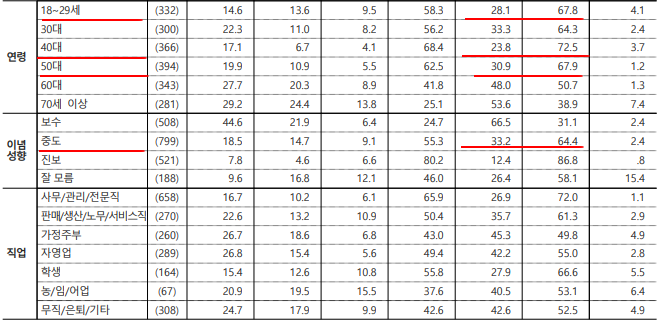 특히 30~50대의 경우는 더불어민주당 지지율이 모두 과반을 넘었다. 반면에 60대와 70대 이상 노년층에선 국민의힘 지지율이 모두 과반을 넘었다. 20대의 경우는 더불어민주당 지지율이 우세했으나 43.8%로 유일하게 과반을 넘지 못해 이 세대가 50대 이하 세대 중에선 더불어민주당 지지세가 비교적 약하다는 반증.