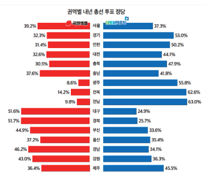 ▲서울 (국힘 39.2% & 민주 37.3%), ▲경기(국힘 32.3% & 민주 53.0%),▲인천 (국힘 31.4% & 민주 50.2%), ▲대전(국힘 32.6% & 민주 44.1%), 충청(국힘 30.5% & 민주 47.9%),▲충남(국힘 37.6% & 민주 41.8%), ▲광주(국힘 8.6% ▲전북(국힘 14.2% ▲전남(국힘 9.8%▲대구(국힘 51.6% & 민주 24.9%)·경북(국힘 51.7% & 민주 25.7%), ▲부산(국힘 44.9% & 민주 33.6%),▲울산(국힘 37.2% & 민주 35.4%),▲ 경남(국힘 46.2% & 민주 34.1%),▲강원(국힘 43.0%▲제주(국힘 36.4%
