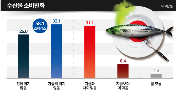4. 오염수 방류 후 수산물 소비변화 : 소비감소 58.1%, 지금과 유사 31.1%, 더 먹을 것 8.4%