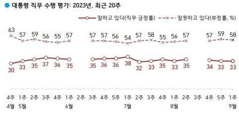 1. 윤 대통령 국정운영평가 : 긍정 33%(5% 하락), 부정 59%(5% 하락)