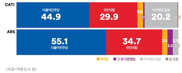 2. 정당지지율 : 민주당 55.1%(1.8% 상승), 국민의힘 34.7%(동일)(ARS, 격차 20.4%)