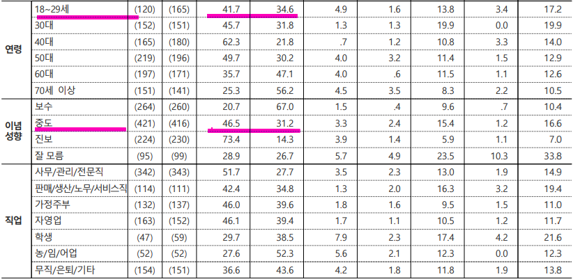 1) 연령별 : 18~20대(민주 49.6%, 국힘 34.3%), 30대(민주 41.9%, 국힘 29.2%), 40대(민당 53.2%, 국힘 31.1%), 50대(민당 45.1%, 국힘 37.7%), 60세 이상(국힘 48.5%, 민주 35.9%)