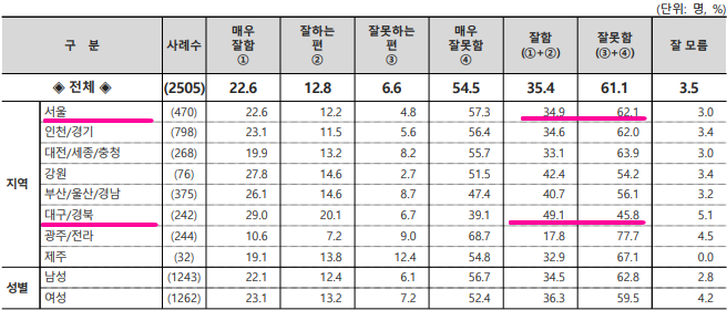 ▲매우 잘함 25.2% ▲잘하는 편 12.6% ▲못하는 편 5.9% ▲매우 못함 54.3% ▲잘 모름 2.1%