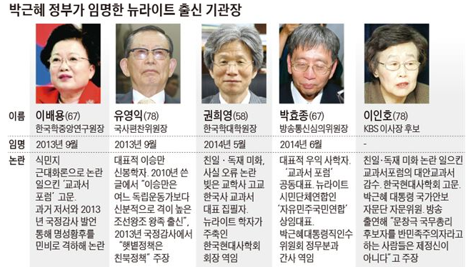 1. 이동관(방통위원장) : 과거 '대안역사교과서'를 편찬하고, '한반도 선진화재단'의 이사장으로 활동, 뉴라이트 대표적 인물, 동아일보 정치부장으로 있던 2004년 뉴라이트라는 용어를 처음 사용했고, 또 이를 소개하는 대규모 기획기사를 주도해 뉴라이트를 국내에 확산시킨 주역