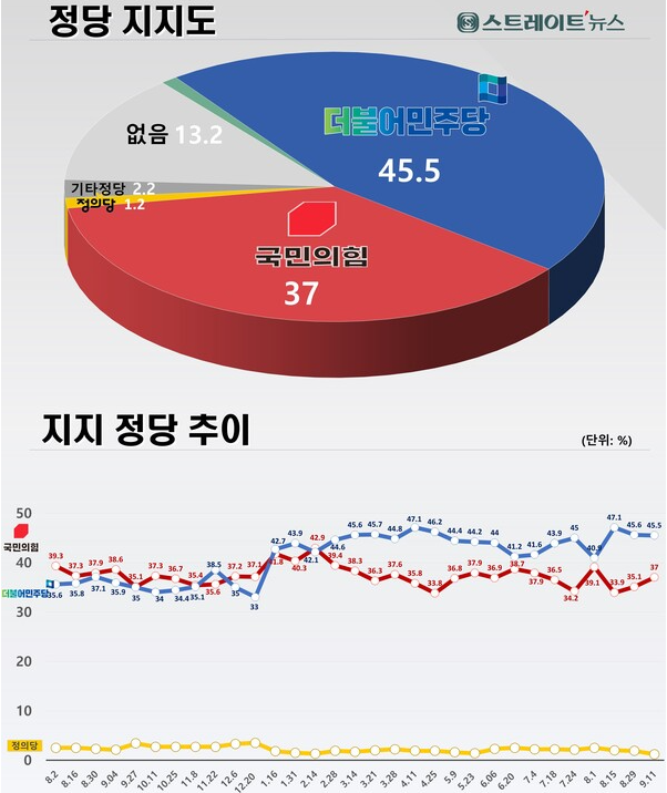 (9월 6일~9월 8일, 만 18세 이상, 1015명, 무선 100% ARS, 표본오차는 95% 신뢰 수준 ±2.2%)