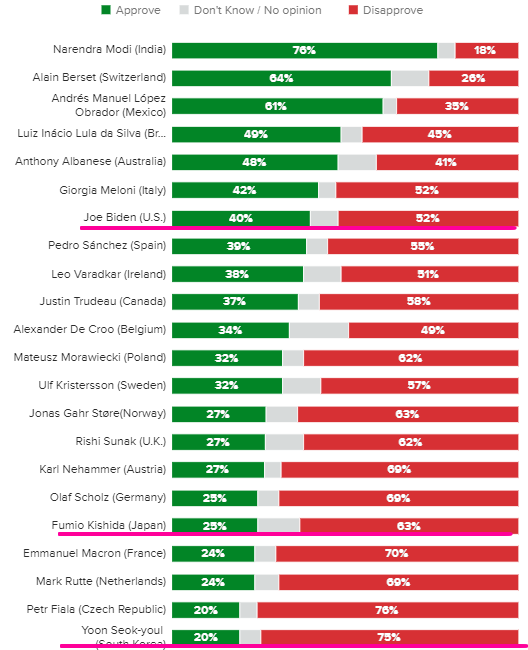 **조 바이든 긍정평가 40% 부정 평가 52%(7위) , 기시다 긍정평가 25% 부정 평가 63%(18위)