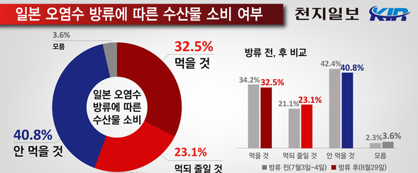 3. 일본 오염수 방류 후 수산물 소비? 안 먹을 것 40.8%, 먹되 줄일 것 23.2%, 먹을 것32.5%