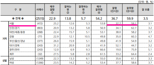 ▲매우 잘함 25.2% ▲잘하는 편 12.6% ▲못하는 편 5.9% ▲매우 못함 54.3% ▲잘 모름 2.1%