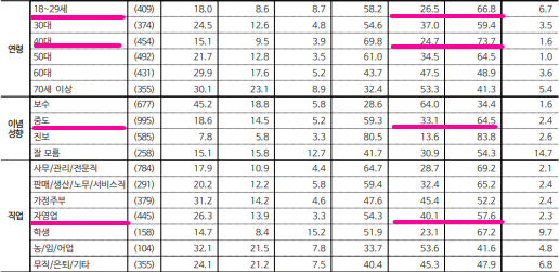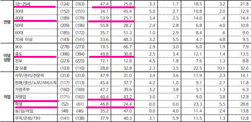 1) 연령별 : 민주당은 20대와 40대, 50대에서 확실한 우위