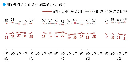 2023.09.04 - [분류 전체 보기] - <9월 1주 여론조사집계> 윤 대통령 지지율 및 정당 지지율 등