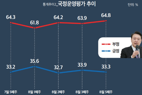 * 부정평가 이유 : '후쿠시마 오염수 방류 문제'(15%), '외교'(11%), '경제/민생/물가'(9%), '독단적/일방적'(7%), '소통 미흡', '전반적으로 잘못한다'(이상 6%), '통합·협치 부족', '경험·자질 부족/무능함', '서민 정책/복지'(이상 3%)