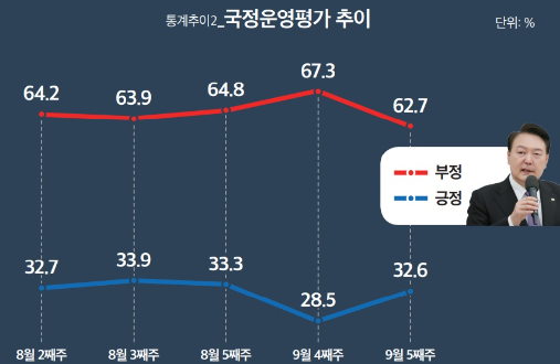 1. 윤대통령 국정운영평가 : 긍정 32.6%(4.1% ↑), 부정 62.7%(4.6% ↓)