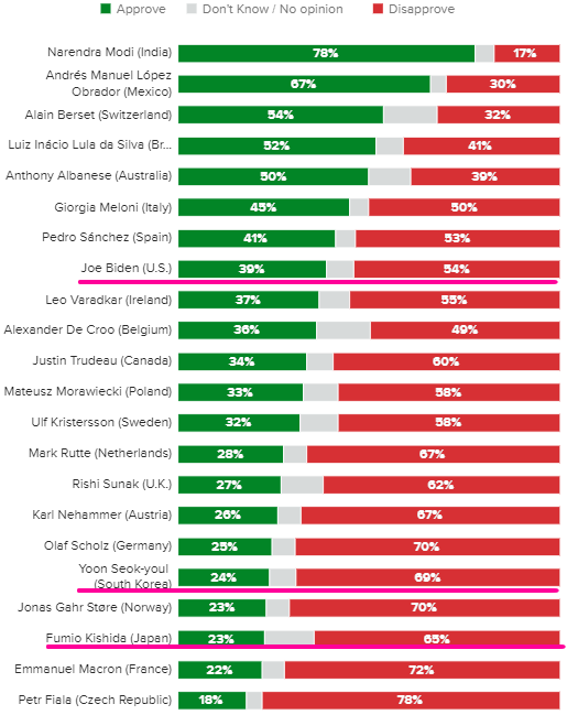 **조 바이든 긍정평가 39% 부정 평가 54%(8위) , 기시다 긍정평가 23% 부정 평가 65%(20위)