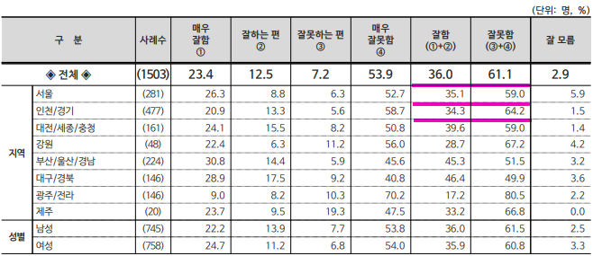 * 국정운영신뢰도 : 신뢰한다 36%, 신뢰하지 않는다 60%