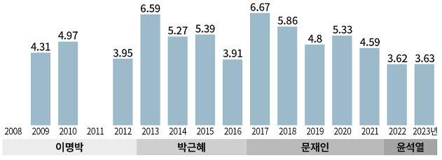 * 역대 집권 2년 차에서 가장 낮은 수준, 이명박(3.87점/2012년), 박근혜(4.61점/ 2014년), 문재인(5.27점/2017년)