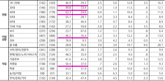 2) 연령대 : ▲20대(민주 47.2%, 국힘 28.4%), ▲30대(민주 41.4%, 국힘 36.9%), ▲40대(민주 61.9%, 국힘 22.4%) ▲50대(민주 55.1%, 국힘 30.8%) ▲60대 이상(국힘 51.0%, 민주 37.7%)