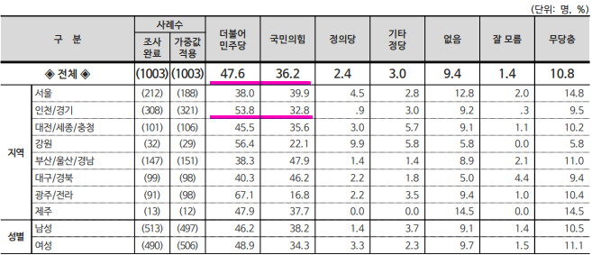 ▲서울(민주 46.5%, 국힘 36.0%), ▲경기 인천(민주 52.0%, 국힘 32.8%), ▲대전·세종·충청(민주 46.3%, 국힘 37.5%), ▲광주·전라(민주 58.3%, 국힘 22.6%), ▲대구·경북(국힘 54.3%, 민주 29.7%), ▲부울경(민주 44.1%, 국힘 38.9%), ▲강원 제주( 민주 49.2%, 국힘 38.0%)