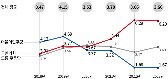 4. 주요 정당 신뢰도 : 민주당(4점), 국민의힘(3.5점)