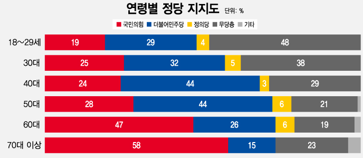 * 민주당은 40대(3.7% p), 60대 이상(6.4% p)에서 올랐고, 18∼29세(5.1% p), 30대(7.2% p), 50대(4.4% p)에서 하락