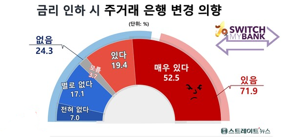5. 금리인하 시 주거래 은행 변경의향? 있음 71.9%, 없음 24.3%