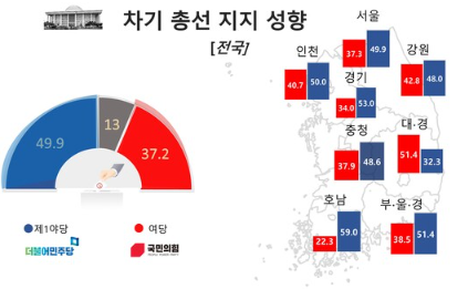 4. 내년 총선지지 : 민주 49.9%, 국힘 37.2%