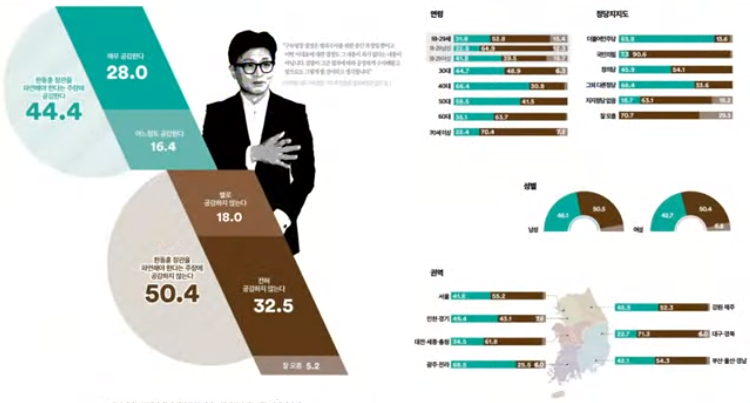 6. 한동훈 장관 파면에 대한 생각? 공감한다 44.4%, 공감하지 않는다 50.4%(CATI)