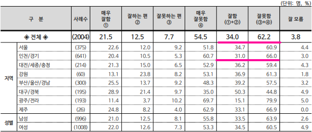 2) 지역별 : 서울(긍정 24.4% 대 부정 70.3%), 경기·인천(긍정 27.3% 대 부정 67.7%), 대전·충청·세종(긍정 30.9% 대 부정 61.8%), 광주·전라(긍정 11.8% 대 부정 84.5%), 강원·제주(긍정 21.9% 대 부정 72.9%), 대구·경북(TK)(긍정 45.5% 대 부정 49.4%), 부산·울산·경남(PK)(긍정 40.7% 대 부정 55.5%)
