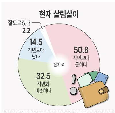 5. 지난해 보다 살림살이는 어떤지? 작년보다 못하다 50.8%, 비슷하다 32.5%, 작년보다 낫다 14.5%