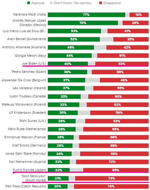 **조 바이든 긍정평가 40% 부정 평가 53%(7위) , 기시다 긍정평가 22% 부정 평가 65%(20위)