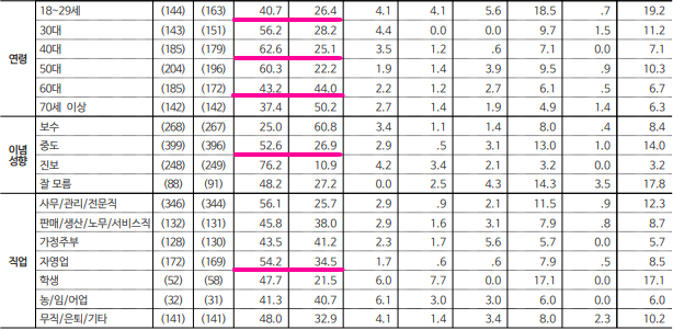 2) 연령별 : △20대 이하 30.7% vs 43.1% △30대 32.0% vs 41.6% △40대 22.6% vs 56.1% △50대 32.1% vs 51.8% △60대 이상 44.8% vs 37.1%
