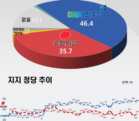 2. 정당지지도 : 국민의힘 35.7%(2.1% 상승), 더불어민주당 46.4%(2.1% 하락)