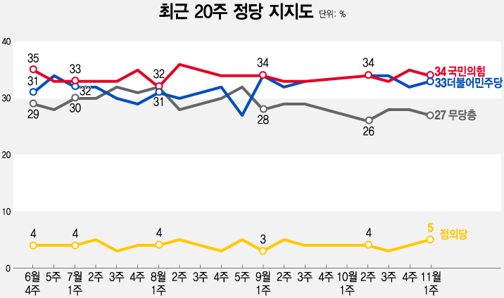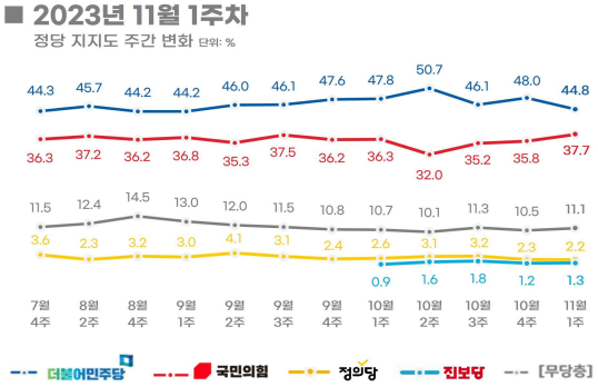 2023.11.13 - [분류 전체보기] - <11월 3주 여론조사집계> 윤대통령 지지율 및 정당 지지율 등