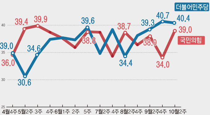 2. 정당지지도 : 국민의힘 39.0%(5.0% 상승), 민주 40.4%(0.3% 하락)