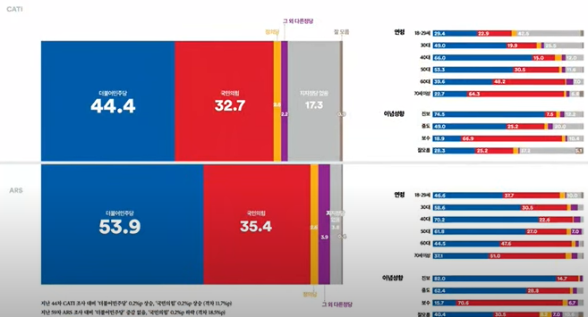 1) 연령별 : ▲ 20대 : 국힘 35.4% 대 민주당 32.0%(7%하락) , ▲ 30대: 국힘 36.3% 대 민주당 33.8%(8.9%하락) , ▲ 40대 : 국힘 14.3% 대 민주당 63.9% , ▲ 50대 : 국힘 25.6% 대 민주당 49.1% ▲ 60대 이상 : 국힘 48.0% 대 민주당 32.3%