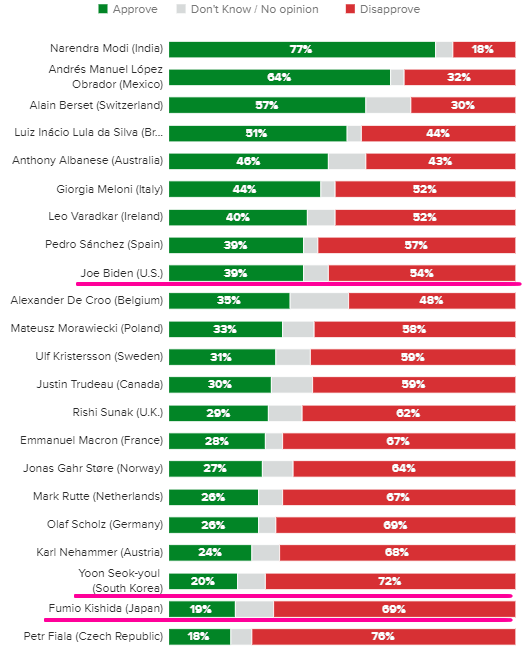 **조 바이든 긍정평가 39% 부정 평가 54%(9위) , 기시다 긍정평가 19% 부정 평가 69%(21위)
