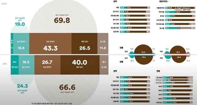 ▲ 서울 36.7% vs 46.9% ▲ 인천·경기 36.9%' vs 44.9%, ▲ 대전·세종·충청 40.8% vs 40.7% ▲ 광주·전라 19.8% vs 58.7% ▲ 대구·경북 37.0% vs 33.6% ▲ 부산·울산·경남 25.2% vs 48.7% ▲ 강원·제주 42.1% vs 30.4% 순