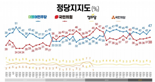 2. 정당지지율 : 국민의힘 38%, 더불어민주당 47%, 정의당 3%