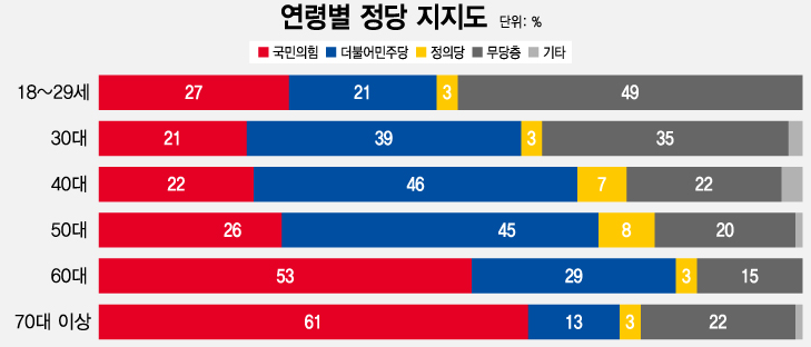 2) 연령별 : 국민의힘 지지율이 가장 높은 연령대는 70대 이상인 반면 민주당 지지율이 가장 높은 연령대는 40대
